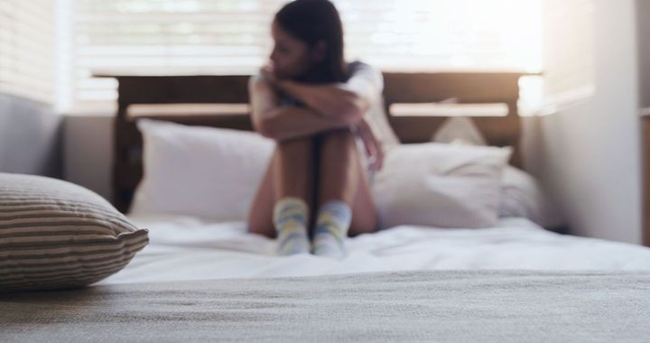 Depression, anxiety and woman in bed thinking, sad and having mental health issue at home. Broken heart, stress and lady person in crisis, abuse or ptsd, insomnia or fear while mourning in bedroom