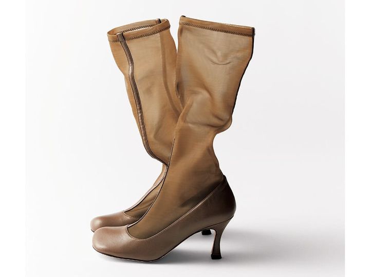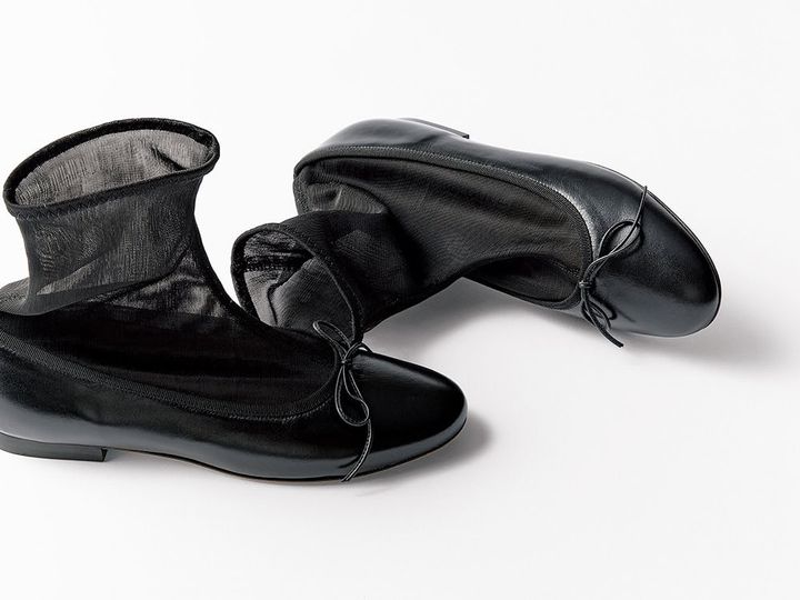バレエシューズにシアーソックスを重ねたようなブーツ。甘さを和らげ、モードな抜け感がスカートの鮮度アップに効果的です。バレエシューズ×チュール素材のドッキングが新鮮。