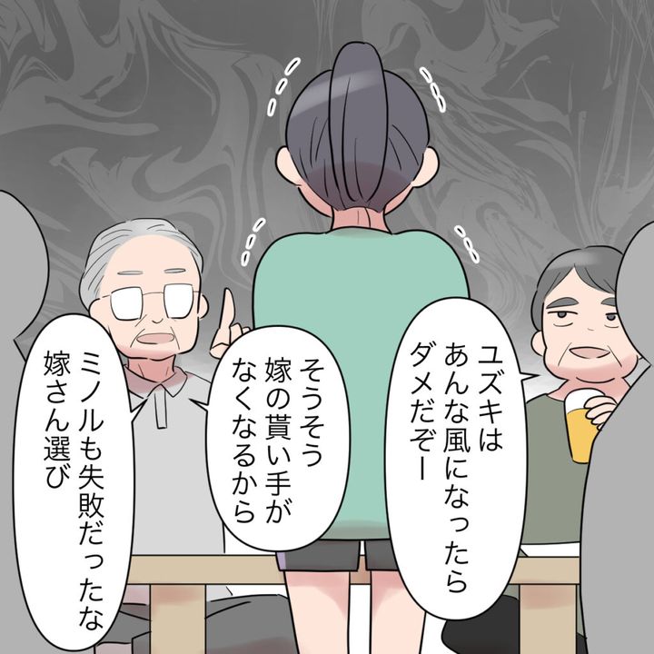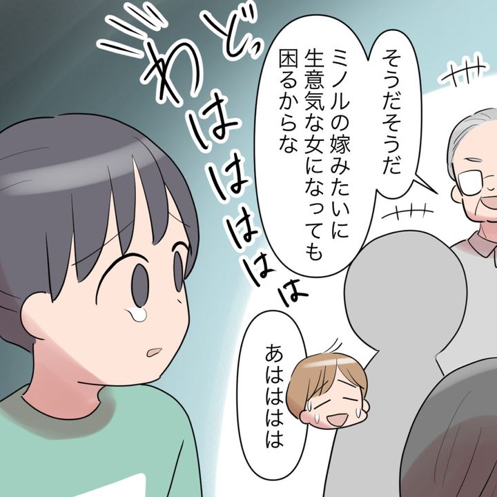 「そうだそうだ。ミノルの嫁みたいに生意気な女に育っても困るからな」と私を全否定する親戚。そう言われているのに「あはははは」と笑っているだけのミノルを見て、ユズキは涙ぐんでいました。
