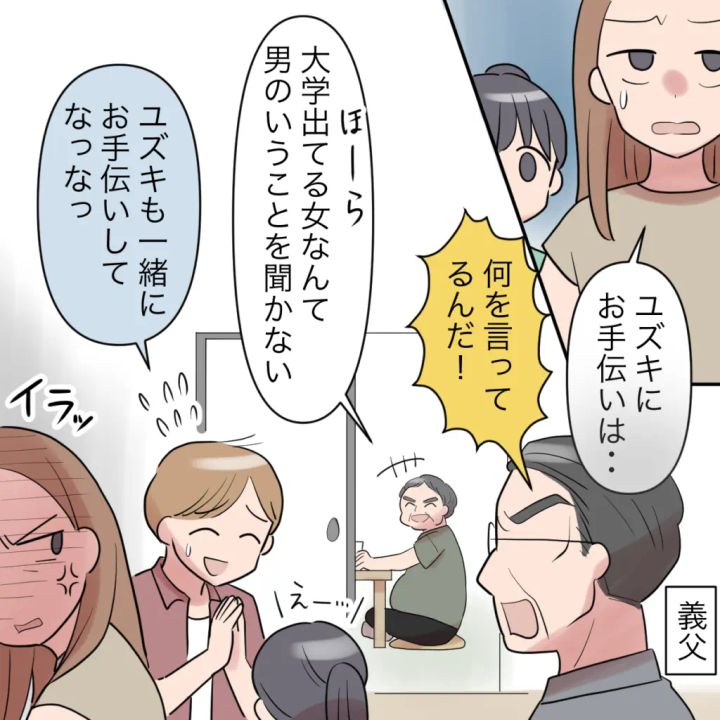 手土産を渡した後、「ユズキにお手伝」いは・・私がそういいかけると、「何を言ってるんだ!」と義父が言い出し、それを聞いていた申請も、「ほーら、大学出てる女なんて、男の言うことを聞かない」と文句を言う親戚にイライラが止まらない私。その頃ミノルは、「ユズキも一緒にお手伝いして。なっなっ」とユズキを説得していました。