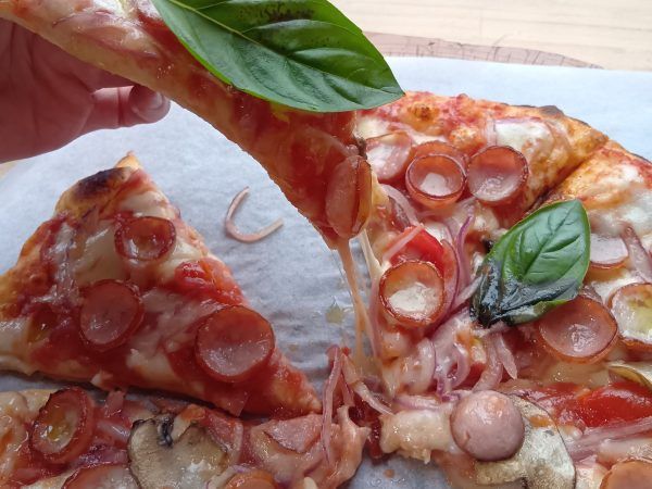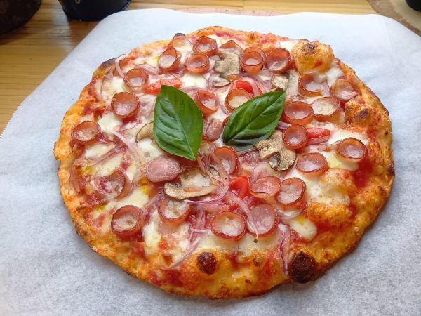 ★具だくさんの贅沢ピザ トマトやマッシュルームが入ったトマトソースの上に、モッツァレラチーズやソーセージがたっぷり。