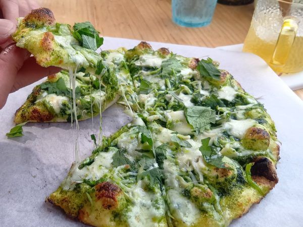 ★青じそとしらすのピザ 青じそとしらすにモッツァレラチーズが融合。和風テイストかと思いきや、チーズがコク旨でしっかりピザらしさを感じます。 たっぷりと伸び〜るチーズと青じそペーストが相まって、とってもジューシー♪ これは日本人好みのピザですね。