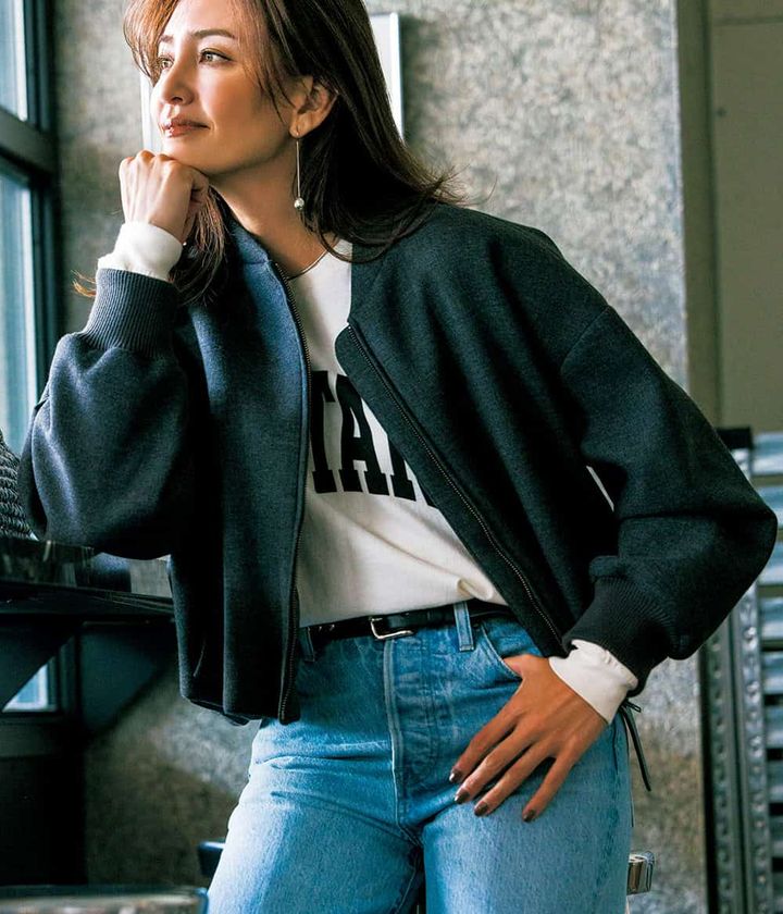 トレンド感ある短か丈ブルゾンで、ママランチもカジュアルスタイルを格上げ。