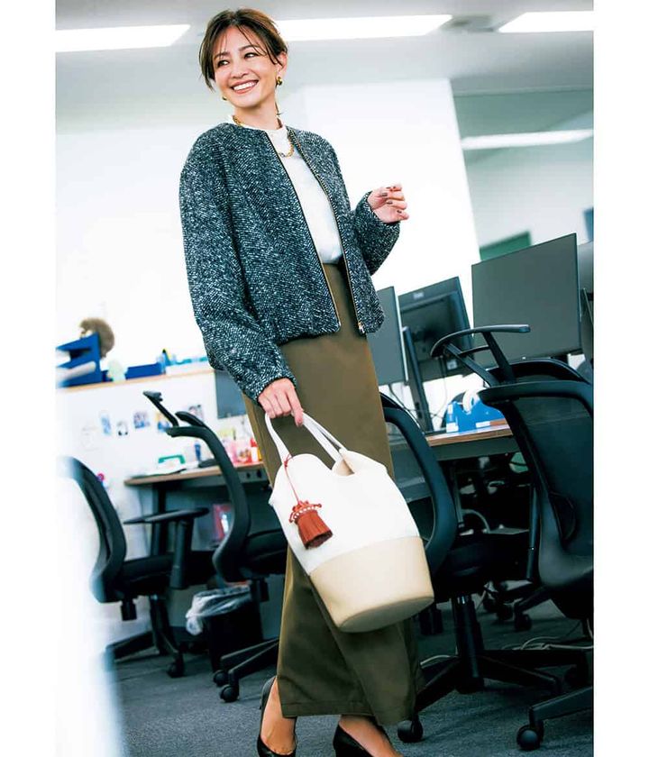 ツイードブルゾン¥49,400(23区/オンワード樫山)ブラウス¥31,900(サクラ/インターリブ)スカート¥24,970(イウエン マトフ/ユナイテッドアローズ 渋谷スクランブルスクエア店)バッグ¥165,000チャーム¥42,900(ともにJ&M デヴィッドソン/J&M デヴィッドソン カスタマセンター)パンプス¥19,800(オデット エ オディール/オデット エ オディール 新宿店)ピアス¥20,900ネックレス¥45,100(ともにローラロンバルディ/八木通商)