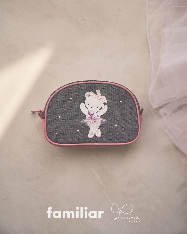 さらに今回のポーチだけの特別仕様として、ダリア柄のレオタードをまとった立体的なクマちゃんが、オリジナルのバレエポーズで登場。
