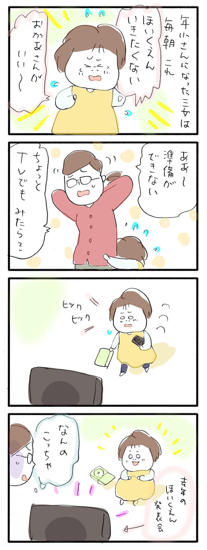 毎朝「ほいくえんいきたくない」「おかあさんがいい!」と泣いてしまう…。そんな娘が観たがる動画は…【よっといで3姉妹・セレクト】