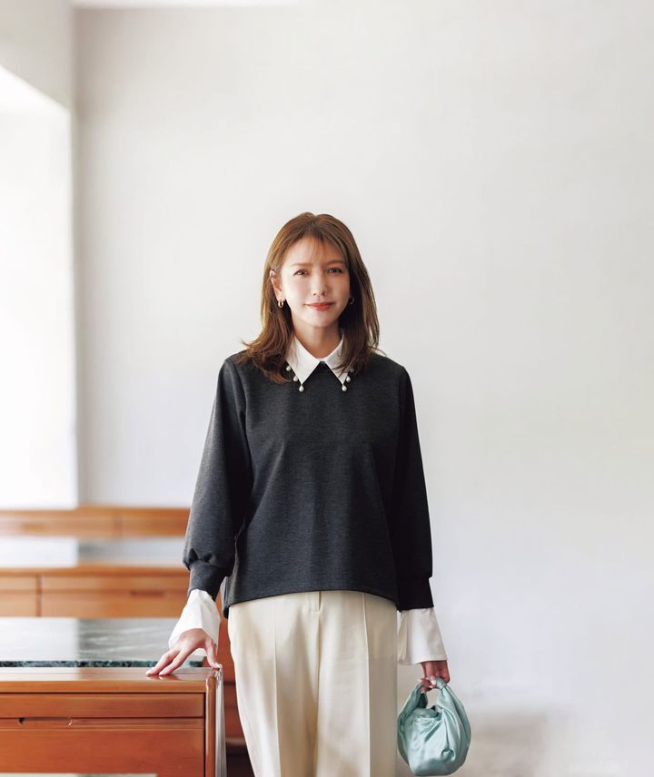 揺れるパール衿が品よく華やぐ大人仕様のトップス。衿・カフスはすべて着脱可能で、1枚で4通りの表情が楽しめるのも魅力です。明るいパンツを合わせれば、ダークグレーの重さが抜けて柔らかい印象に。忙しい朝も迷わず手に取れる、頼もしさ満点の上品トップスです。