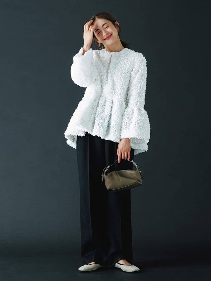 ペプラムブラウスは、着るだけできちんと可愛いが完成する優秀トップス。高めウエストとふんわりフレアが女性らしい印象を与えると同時に、細見えと脚長効果を発揮します。甘さのあるデザインも白なら上品にまとまり、黒パンツでシャープに引き締めれば、好感度抜群の甘コンサバコーデに仕上がります。