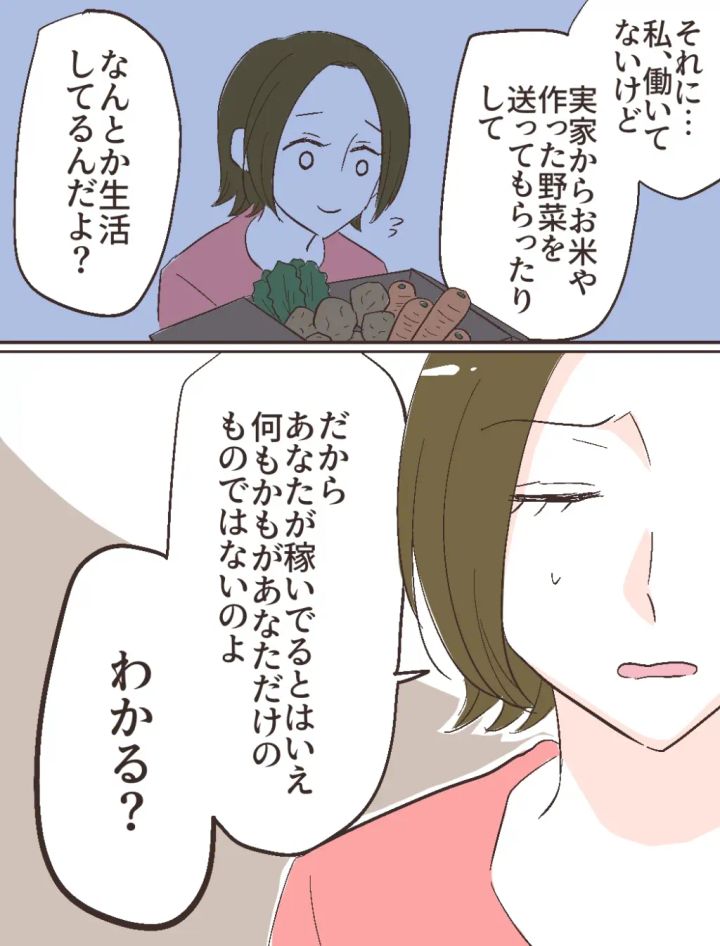 私はそれでもめげずに訴え、「それに・・私、働いてないけど、実家からお米や作った野菜を送ってもらったりしてなんとか生活してるんだよ?だから、あなたが稼いでるとはいえ、何もかもがあなただけのものではないのよ。わかる?」と私がどれだけ必死にやりくりしているか伝えました。