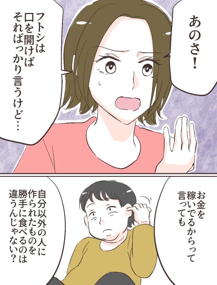 「あのさ!フトシは口を開けばそればっかり言うけど・・お金を稼いでるからって言っても、自分以外の人に作られたものを勝手に食べるのは違うんじゃない?」と必死に訴えるも、フトシは耳をほじりながら上の空。