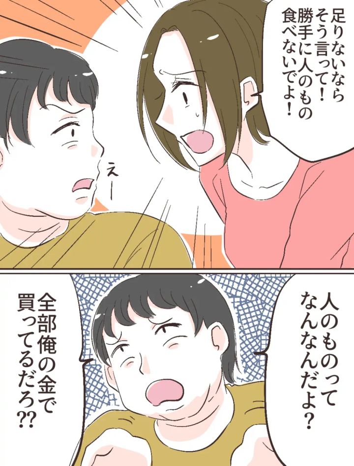 ヒカリさんの夫フトシさんはいわゆる食い尽くし系。子ども達やヒカリさんが食べる分は一切考えず自分の食べたいだけ食べ、足りないと他の人のお皿からも取って食べてしまうフトシさん。ヒカリさんが体のことを考えて野菜を出すと、野菜嫌いなフトシさんは「嫌がらせ」と捉えて不機嫌になってしまいます。フトシさんの食事量でかさむ食費、家族のことを考えずに欲求のまま食べてしまうフトシさんに悩むヒカリさんですが、もう少し考えてほしいと伝えても「食べ物のことで我慢したくない」「俺の金だろ」と聞く耳を持ちません。その後、ヒカリさんはフトシさんにはリビングに食事を用意し、自分と子どもたちはダイニングで食事をするようにしてフトシさんが子ども達の分まで食べてしまうのを阻止しようと考えました。お菓子もフトシさん専用の箱を用意し、子ども用のお菓子は別の場所に隠しておいて「これで上手くいくはず」と期待していたヒカリさん。しかし、それでもフトシさんは探し当てて子どもたちのお菓子を食べつくしてしまい、ヒカリさんが怒るとまたしても「俺の金じゃん」と反省ゼロ。そんなある日、いつものように別々に食事をしている途中でキッチンにソースを取りに行ったヒカリさんが戻ってくると、なぜか子どもたちの前にフトシさんの姿。フトシさんはヒカリさんの食べかけのご飯を平らげており、「まだ食べてたよ?」と言うヒカリさんに「だったら席立つなよ!紛らわしいな!」と逆切れ。さらに、まだ食べている途中のユウヤくんに「それ残すのか?パパに貸しなさい」と手を伸ばそうとし、「残さないよ!」とユウヤくんは必死におかずを死守しました。