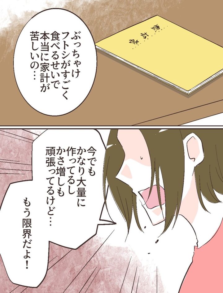 そして、家計簿を見せながら「ぶっちゃけ、フトシがすごく食べるせいで本当に家計が苦しいの・・。今でもかなり大量に作ってるし、かさ増しも頑張ってるけど・・もう限界だよ!」とこれまでずっと抱えていた思いをフトシにぶつけました。