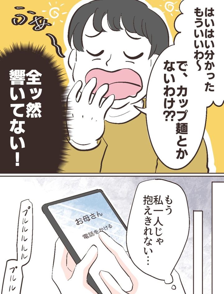 しかし・・、フトシは「はいはい。分かった。もういいわ~。で、カップ麺とかないわけ??」とあくびをしながら一言。信じられない。全ッ然響いてない!ここまで言ってもわかってもらえないなんて・・私は絶望してしまいました。もう私一人じゃ抱えきれない・・。私は縋る思いで実家の母に電話をかけました。