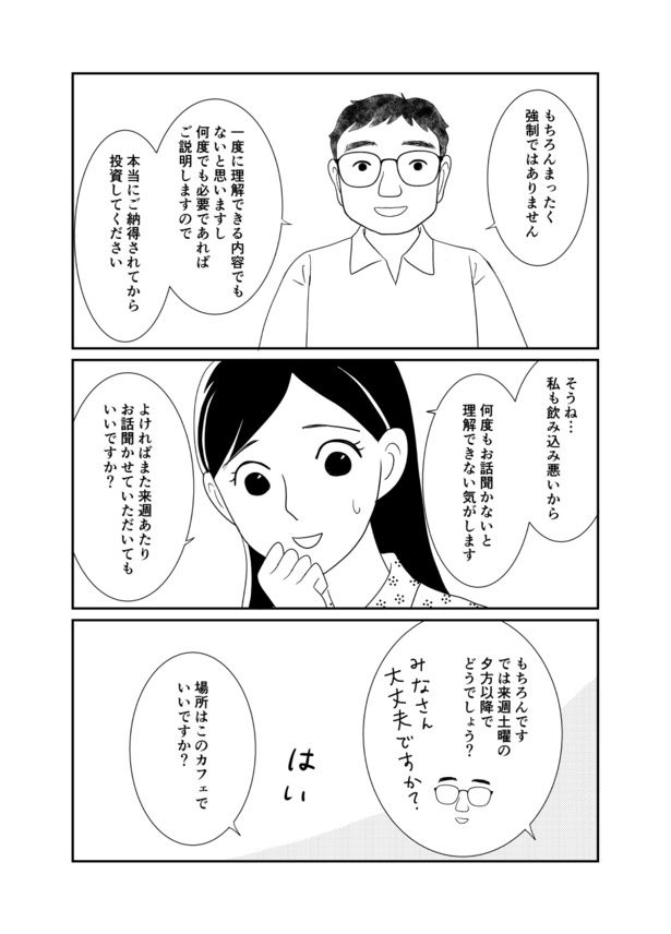 3. 誠実そうな男性が語る“うさんくさい”投資話。この投資、本当に信じていいの?/100万円、預けた先は“詐欺”でした。②