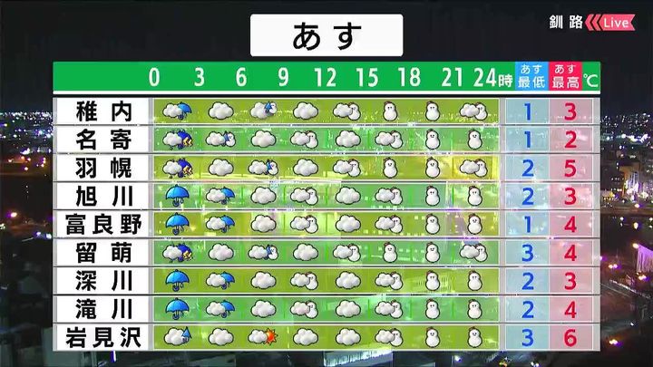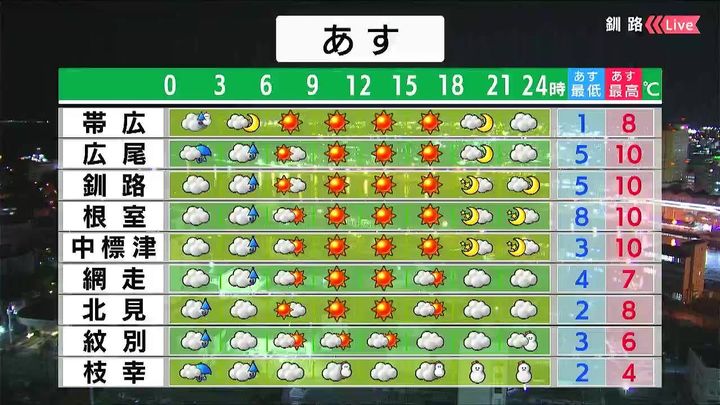 明け方まで雨が降り、帯広では雪がまじります。日中は晴れますが、道北の枝幸では雪で、夜は降り方が強まるでしょう。