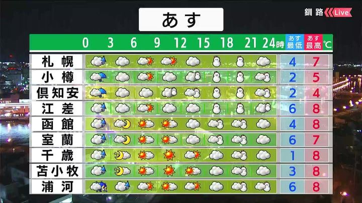 あす21日(金)の時間ごとの天気。道央・道南からです。