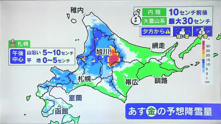 上川や空知、後志など日本海側の内陸で広く青色、10センチ前後の雪が降り、大雪山系では最大30センチでしょう。