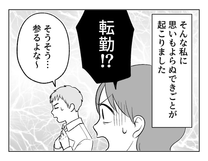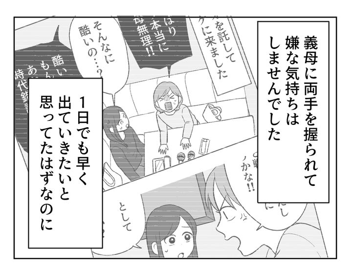 私(チヒロ)は、長男・レオを出産後に退職。しかし夫・マナブの一馬力ではマイホーム資金は貯まらないので、「3年間の期間限定」で義実家で同居をはじめました。しかし義母の口出しがひどく、私は早々に疲れてしまったのです。そんなときツカサさんと出会い、すっかり意気投合。ところがある日、ツカサさんと義母が仲良く談笑している姿を見てしまいます。ツカサさんは表面的には私の味方のような態度を取っておいて、心の中では義母の味方だったのでしょう。しかし幼馴染は私に、ツカサさんの「大人の対応」を見習えと一喝。実際、義母との間に私の悪口は一切なかったと知り、私は自分の幼なさを思い知ったのでした。このままツカサさんと離れていた方がいいのではと悩んでいると、夫の転勤が決まり……?