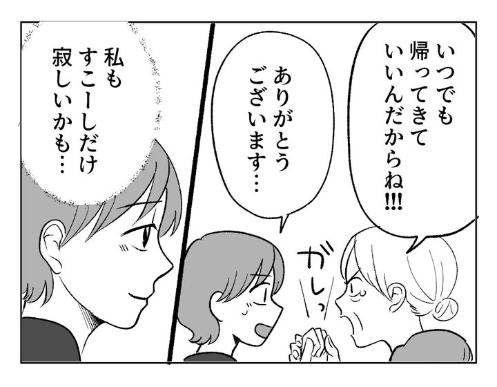 ツカサさんに何を言おうか悩むなか、転勤までのカウントダウンは非情にも迫ってきます。お義母さんとの関係は、お互いに心許せる部分が増えてきたのでしょう。お義母さんに手を握られても、もう以前のような嫌悪感はありません。それも、ツカサさんがそばで支えてくれた同居期間があったからこそ。ツカサさんの笑顔が自然と心によみがえります。