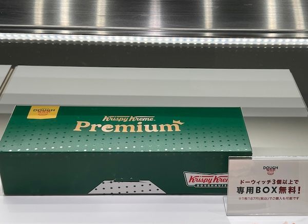 ショーケースの上段には4種の新シリーズが並んでいます!福岡限定の『DOUGH-wich(ドーウィッチ)』。 “ここでしかできないブランド体験”を地域限定でお届けする『クリスピー・クリーム・プレミアム』シリーズの1つで、北海道・東京・名古屋に続く4つ目のプレミアムシリーズです。