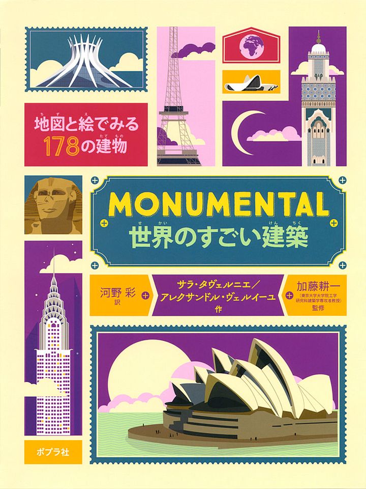 古今東西、素晴らしい建物が世界中に存在します。本作品では、誰もが知るエッフェル塔や自由の女神を始め、マチュ・ピチュやタージマハルなどの世界遺産や、シドニー・オペラハウスや伊藤豊雄建築ミュージアムなどの現代建築まで178ものモニュメントを紹介。イラストはもちろん、高さ、建築期間、建築家名、目的、受賞名やロケ地情報なども盛り沢山で発見が多い大型建築地図絵本。色彩のセンス抜群。いつか実物を見に行く夢も膨らみます。