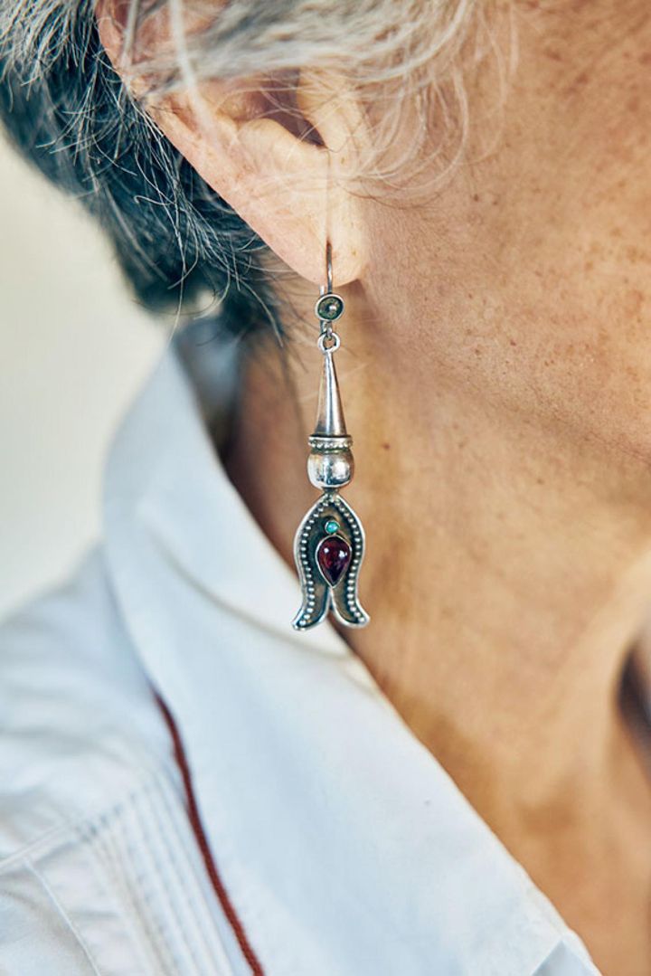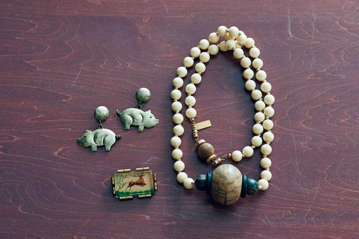 養母からちょっとそこまで行くのにも身だしなみを整えるようにしつけられたせいか、服装にはいつも気を使うようになりました。犬の毛が気にならないシャツは私のユニフォーム。アクセサリーも毎朝どれにしようかと選ぶひとときも含めて、暮らしの楽しみのひとつです。お気に入りはメキシコで買った豚のピアスと、香港で買ったネックレス、インドの友人から買った鹿のブローチ。今日はインドネシアで買ったピアスを。