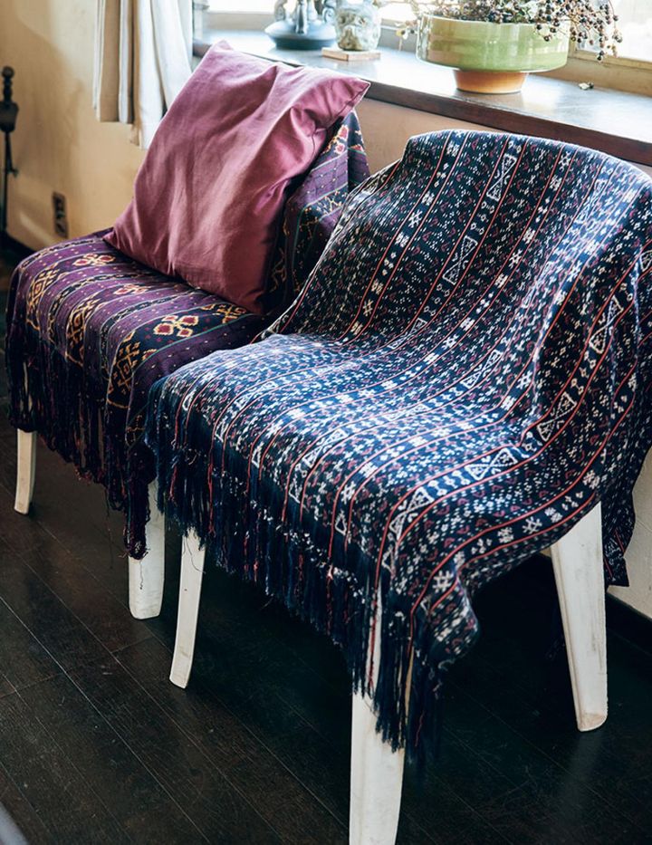 リビングで使っているガーデンチェア。軽く扱いやすいのはいいのですが、そのまま使うと味けないのでバティックをかぶせています。秋冬はこっくりとした色みのものを、夏は白地の多いさわやかな柄をかけて、季節ごとに模様替えを。