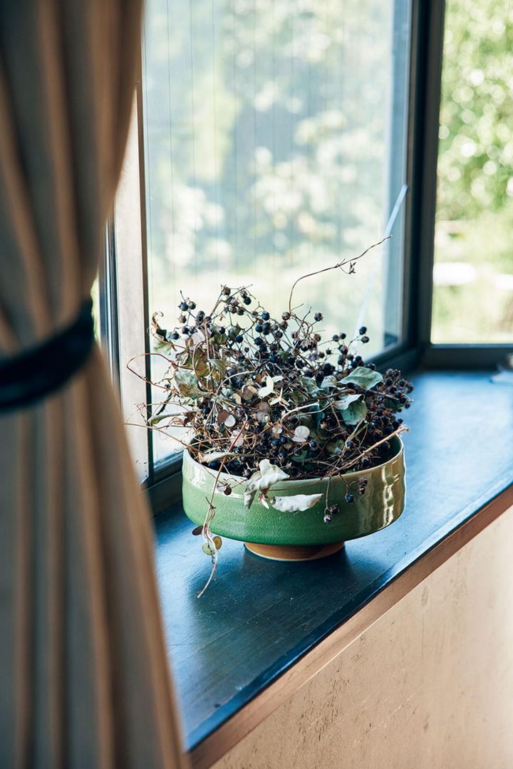 庭のサルスベリを切ったあとの実を器に入れてインテリアの彩りに。ドライになってもきれいな植物なので、ほったらかしでも絵になるのがいいところ。もう少しこのままの状態で楽しんで、そのうちリースにしようかなと思っています。