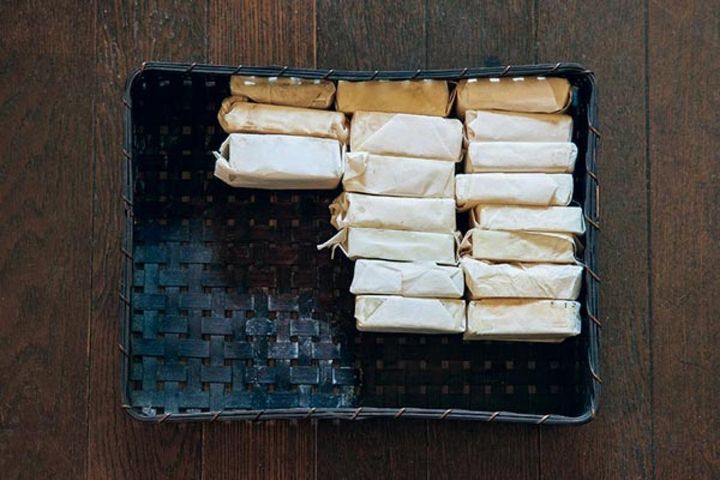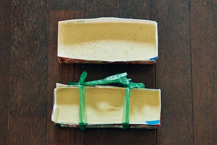 わが家では化粧水同様、石けんも手作り。体も顔もオリーブオイルをベースにした石けんで洗っています。材料で使うカセイソーダは危険な薬品なので取り扱いに注意が必要ですが、作り方は至って単純。すべての材料をかき混ぜて、型に流し、固まったらカットして半紙にくるみ半年ほど寝かせるとできあがります。スクラブがわりにオートミールを入れたり、保湿力の高いアロエを入れたりして自分好みにアレンジできるのも楽しいですよ。