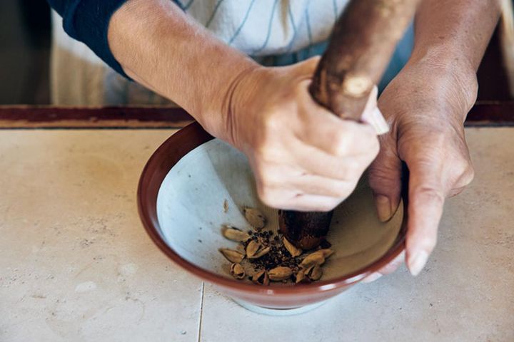 ハーブ同様にさまざまな健康効果のあるスパイスも常日ごろから料理にとり入れています。今日は消化を助けるカルダモン、抗菌効果のあるクローブ、血の巡りをよくするシナモンを紅茶に入れて、香り豊かなチャイを作りました。スパイスは粉末の状態でも売っていますが、自分ですったほうが香りがよく、おいしくいただけます。ちなみに愛用のすりこぎは、拾ってきたカラスザンショウの枝!