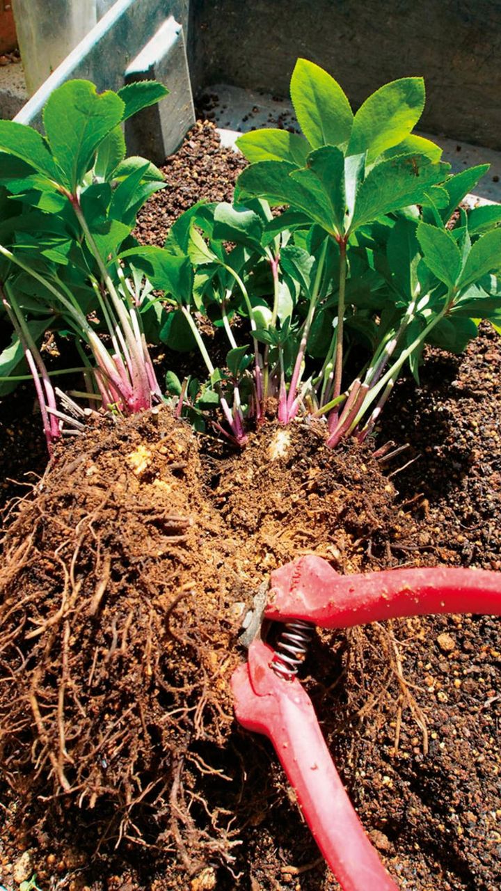 一般的には植えかえや株分けは秋にといわれていますが、私は3月中旬を過ぎたころから、遅くても4月末までに行います。新芽が伸びるこの時期は、株にいちばん勢いのあるタイミングなので、植えかえ時に根が少々傷んでもダメージは少ないからです。