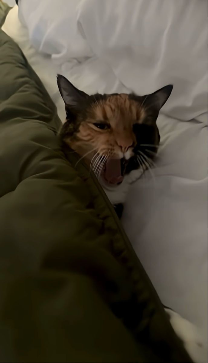 ベッドでぬくぬく。気持ちよすぎて大きなあくびまで飛び出すネコ【アメリカ・動画】