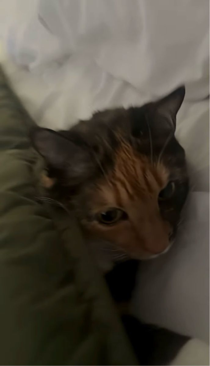 そこでベッドに歩み寄ると・・・、枕元に小さなシルエットを発見! 愛らしいお顔にピンと立ったお耳をもつこの子は・・・こちらのお宅の愛猫『エリー』でした!