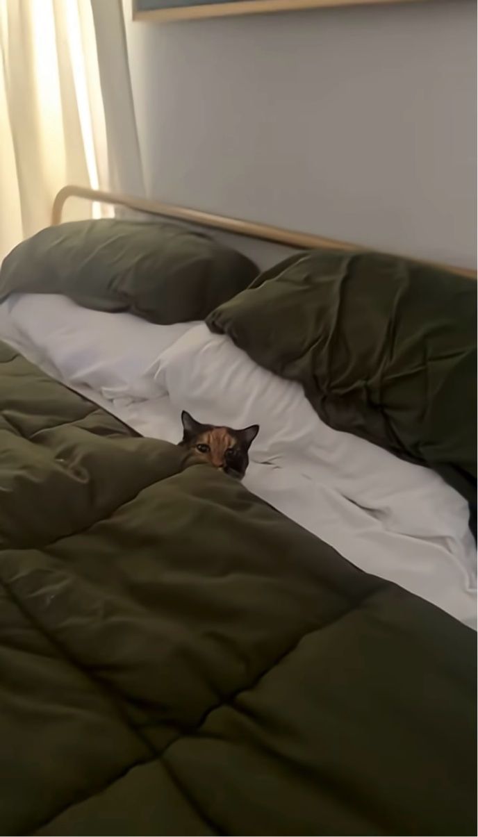 ベッドに潜り込んでぬくぬくしているネコ。 そのくつろぐ様子は、こちらの動画からご覧いただけます。