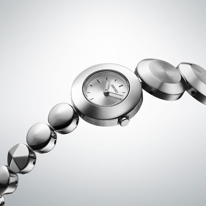 サイズの異なるこまを12時側と6時側で使い分け、他のアクセサリーなどではあまり見られない腕時計ならではのヘアライン仕上げと鏡面仕上げを組み合わせて、柔らかなフォルムの中にフラットな面が際立つデザインを実現。6時側から3つ目のこまだけに、きらりと輝く多面カットを施し、遊び心を演出している。