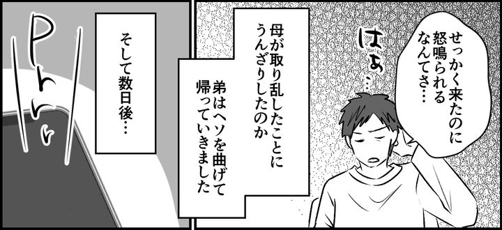 「私は私なりに考えて、マイさんの機嫌を損ねないように気をつかっているのよ! 世間一般のお姑さんや義実家と比べたら、私はだいぶ遠慮しているほうだと思うけど!?」と涙ぐみながら訴える母。弟が帰ってしまったので、話し合いはそこで終了してしまいました。