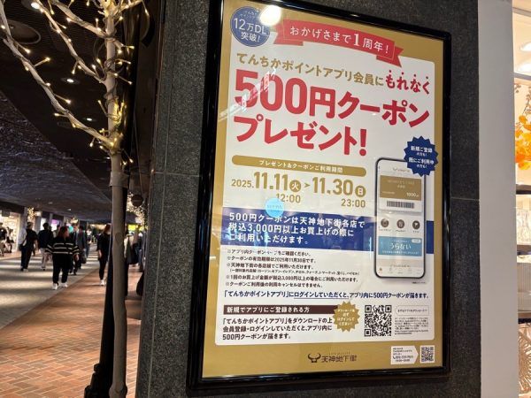 てんちかポイントカードが、昨年11月からアプリに変わったそうです。アプリ1周年を記念して、11月末までアプリをダウンロードすると、全員にてんちかで使える500円分のクーポン券(3000円分以上お買い物で使える)がもらえます!
