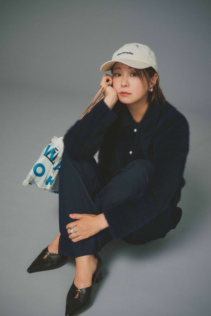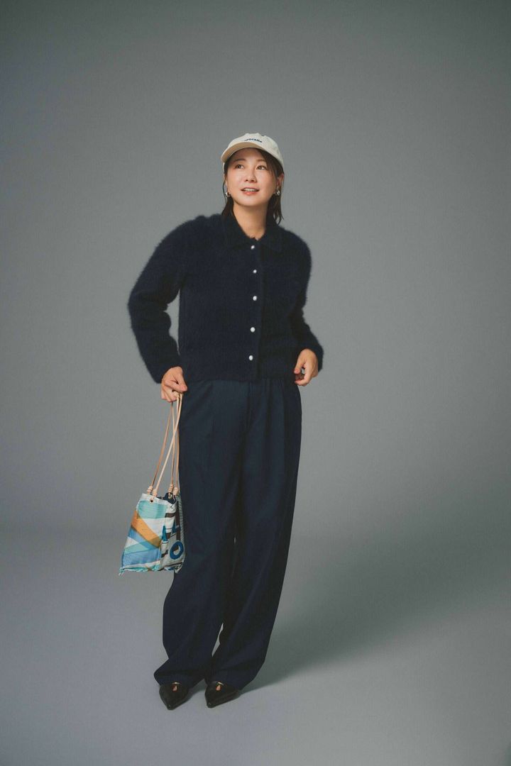 パンツ¥53,900(アンスクリア/アマン)ニット¥35,200(シップス)キャップ¥9,900(アラミンタ ジェームス/ジャック・オブ・オール・トレーズ)バッグ¥18,700(マニプリ)シューズ¥20,900(ル タロン グリーズ)イヤリング¥6,600(アビステ)リング¥21,450(ココシュニック オンキッチュ/ココシュニック)