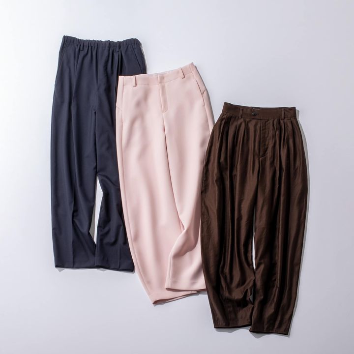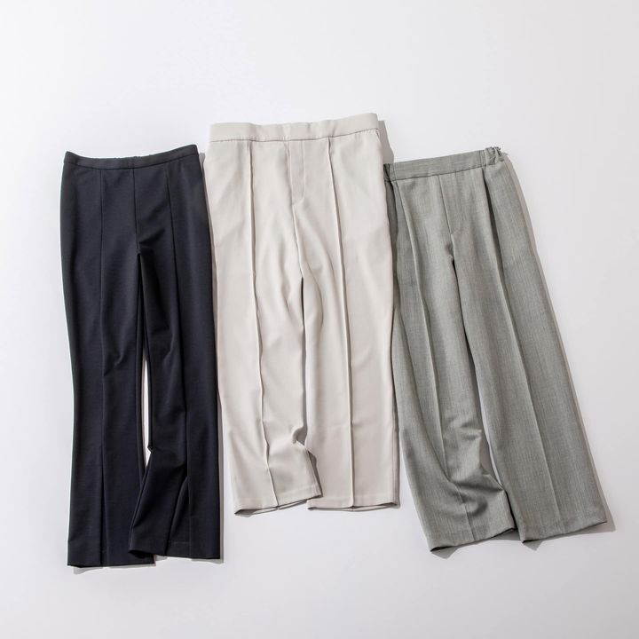 センタープレスが効いたキレイめデザインが、きちんと感と美脚見えの両方を叶えてくれる。(右から)グレー¥27,500(マルモア)ベージュ¥3,839(ベルーナ)ネイビー¥22,000(ル フィル)