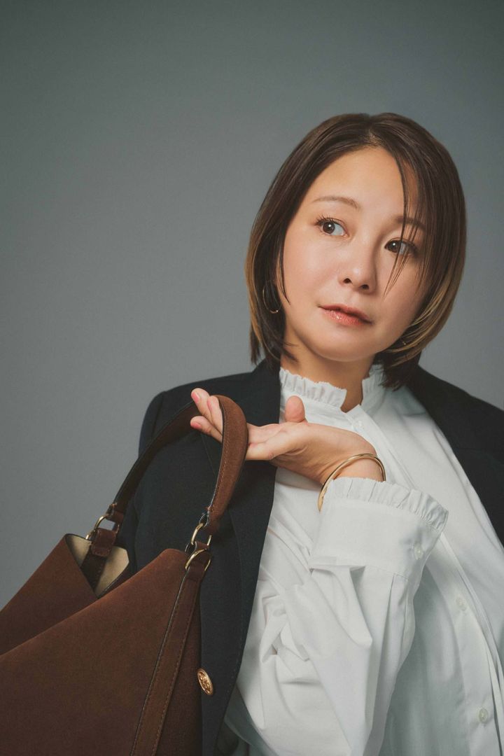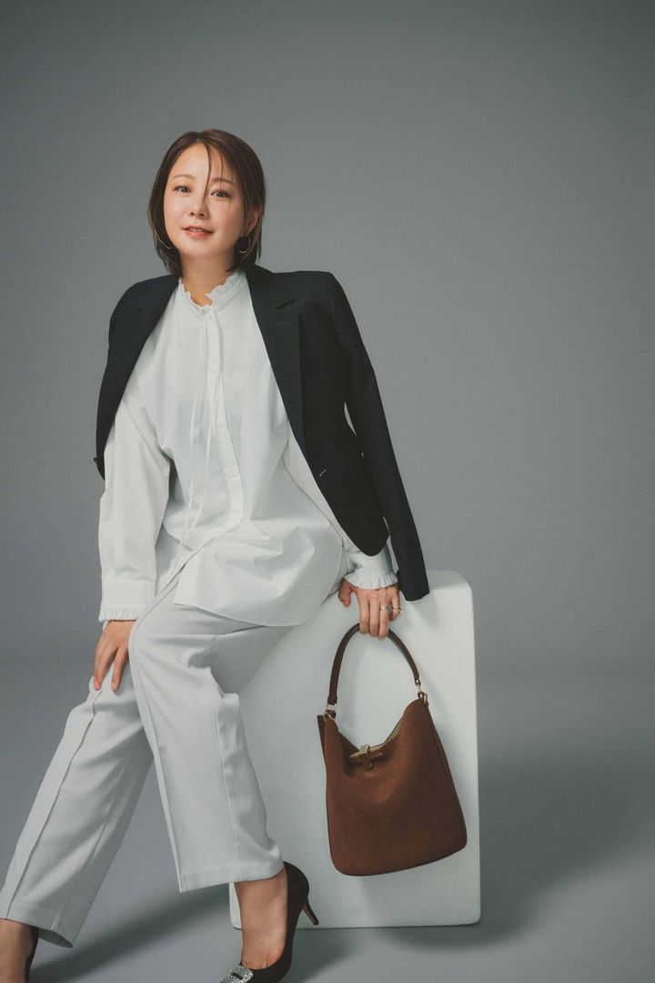 パンツ¥3,839(ベルーナ)ジャケット¥47,300(マカフィー/トゥモローランド)ブラウス¥7,990(アンフィーロ/アンフィーロ<オンワード樫山>)バッグ¥183,700(ザンケッティ/ショールーム ロイト)シューズ¥97,900(ペリーコ/アマン)ピアス¥88,000リング¥73,700(ともにマリハ)バングル¥6,330(エイチアッシュ)