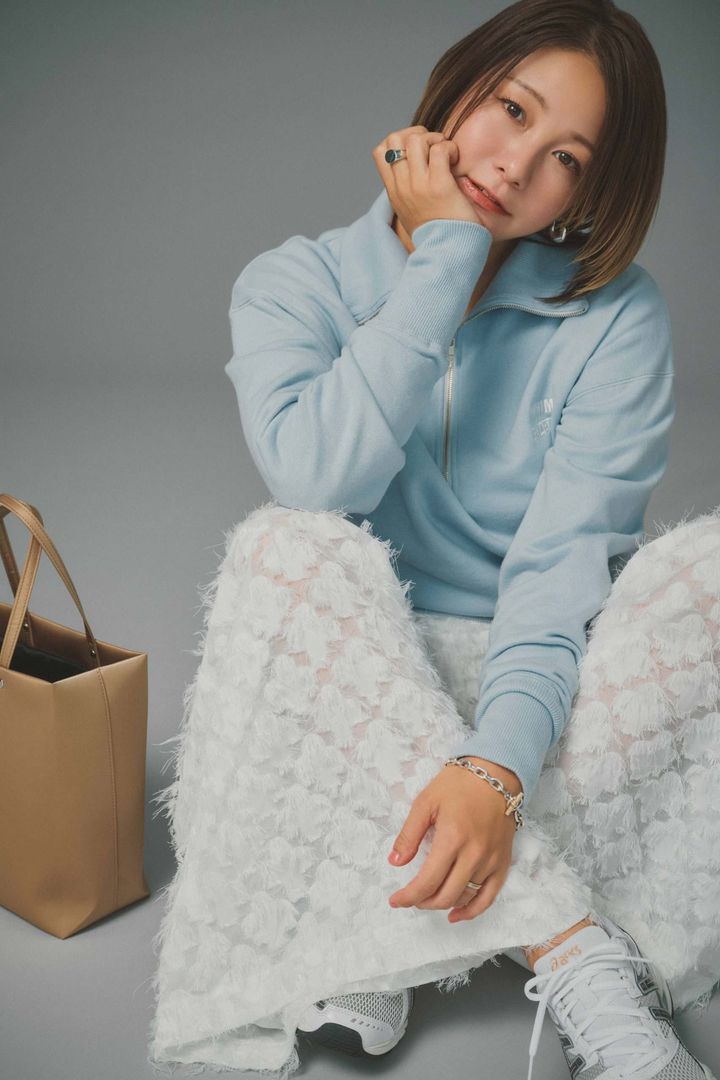 パンツ¥25,000(シーニュ)スウェット¥23,100(ウィム ガゼット)バッグ¥31,900(ヴァジック/ヴァジックジャパン)シューズ¥15,400(アシックス)ピアス¥42,900ブレスレット¥167,200(ともにジジ)リング¥23,100(フィリアム)