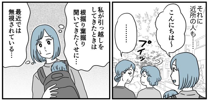 私はアリサ(25歳)。旦那のタカアキ(35歳)と結婚して、旦那の地元に引っ越してきました。旦那とは付き合って間もなく妊娠。しばらく体調不良でバタバタし、産前産後の里帰りもしていたため、引っ越してきてからはまだ数ヶ月です。最近はママ友ができたらいいなと思って、娘のアヤネ(6ヶ月)を連れて児童館の交流スペースへ出かけるようになりました。けれどなんだか避けられているような気がします。私の何が悪いのでしょうか……。