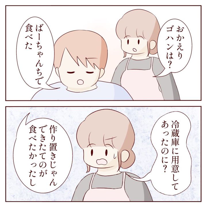 3. 作り置きの食事を拒否、育児する気なしの夫に辟易。義祖母宅に呼ばれてため息。甘やかし祖母と無責任夫|ママ広場マンガ