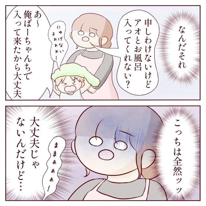 それでもちょうど良いタイミングだったのでアオをお風呂に入れてもらおうとすると、「ばーちゃんちで入ってきたから大丈夫」とこちらを見もせずに言いました。こっちは全然大丈夫じゃないんだけど。