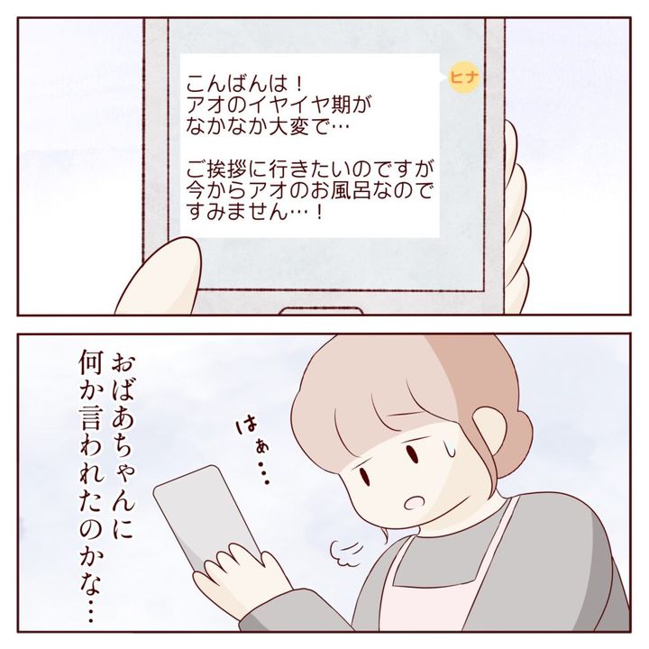 カナコさんは優しくて付き合いやすい人ですし、厳しいことを言ってきたわけではないけれど、突然義祖母の家に呼び出されるなんて、きっと何かあるに違いありません。リクが帰ってきたばかりのタイミングで・・・義祖母になにか言われたのかな。そう思うとまたため息が出ました。