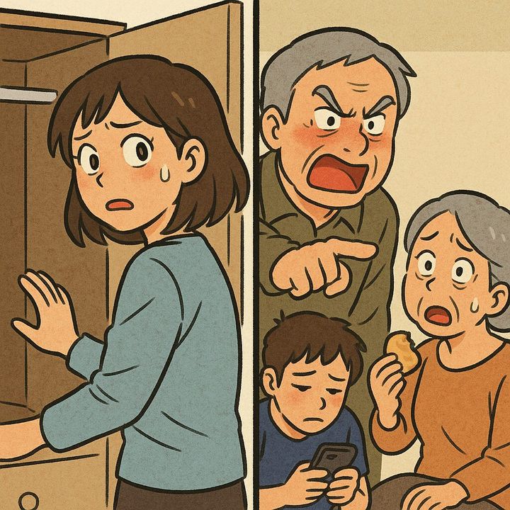 義母はポカンと口を開け、持っていた煎餅を落としました。さらに義父の怒りは夫へ。