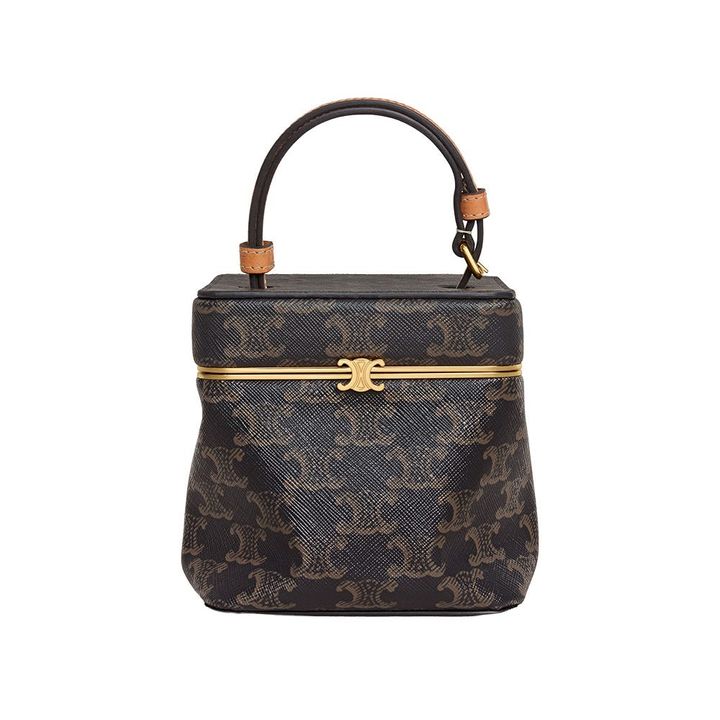 “トリオンフ キャンバス”&ゴールドカラーの留め具が醸すクラシカルなムードと、抜け感のあるキューブ型のバランスが絶妙な一品。ハンドルは長さを調整することができ、ショルダーバッグとして持つことも可能。内側には身だしなみチェックに便利なミラー付き。