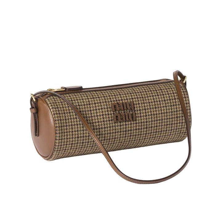 円筒形のシリンダーバッグも、今季注目しておきたいタイプのひとつ。「ミュウミュウ」は、トラッドなハウンドトゥース柄で、レトロなヒネリをプラス。相性抜群の王道プレッピーから、辛口コーデの“ハズし”アイテムとしてまで、いろんなテイストと組み合わせてみて。
