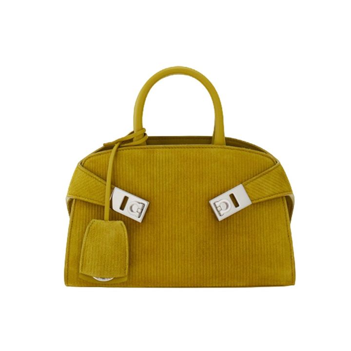 ミニサイズで一段と愛嬌を増したのは、抱きしめるようなデザインがアイコニックな“ハグ”。マスタードカラーのスエードでコーデュロイのような畝を表現し、秋冬らしいぬくもりのある表情に。同じ素材のショルダーストラップ付き。