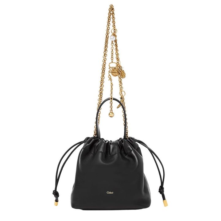 気負わない雰囲気のドローストリングバッグながら、ジュエリーのようなチェーンがアクセサリーいらずの華やかさを加味。シグネチャーのメダルやパールなどのチャームが歩く度に揺れ、「クロエ」らしいリズミカルで自由なムードが楽しめる。